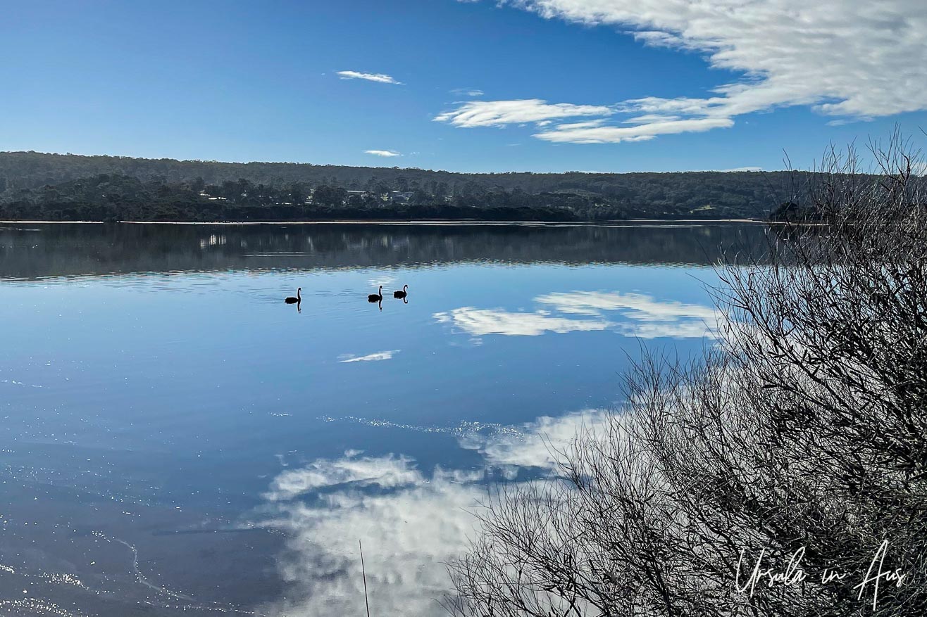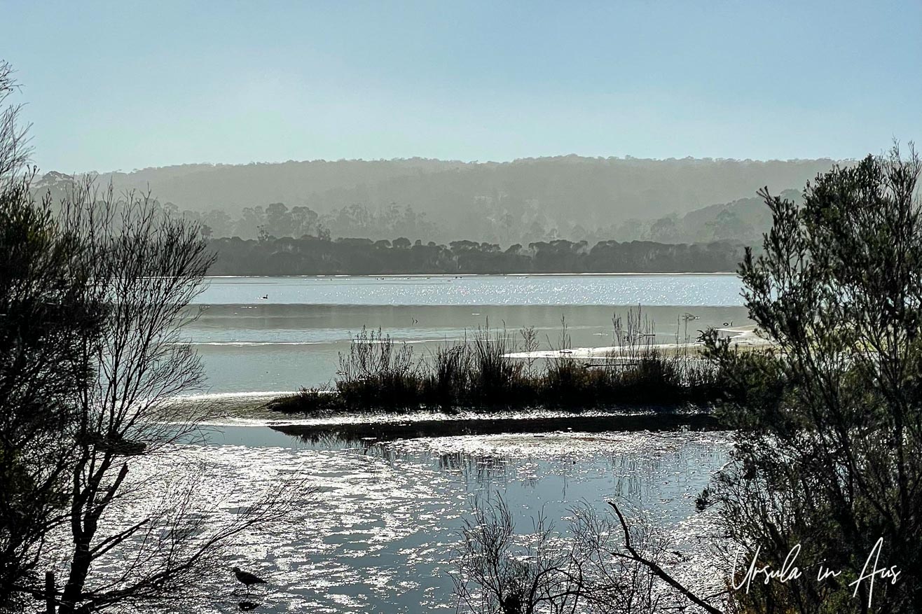 Technically an ICOLL – an Intermittently Closed and Open Lake or Lagoon – Lake Curalo is a brackish body of estuarine water that is tidal, and sometimes completely open to the Pacific Ocean. Surrounded by tea trees (melaleucas) and tall gum trees including woollybutts (Eucalyptus longifolia), it is home to a large population of waterbirds. (08May2021)