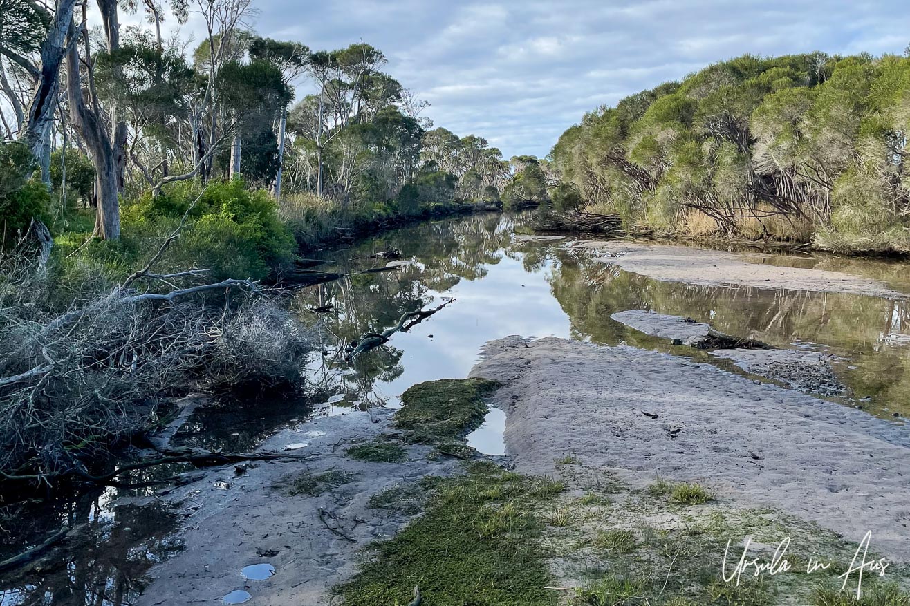 Tea-trees (melaleuca) have a short life-span, and regularly get blown over by strong winds. Palestine Creek is one of several tributaries into Lake Curalo. (06June2021)