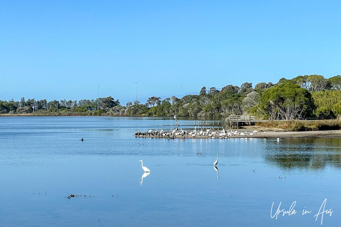 Small numbers of egrets and herons make their homes on the lake, as do large numbers of black swans and Australian pelicans. Gulls and terns stop by regularly. (18May2021)